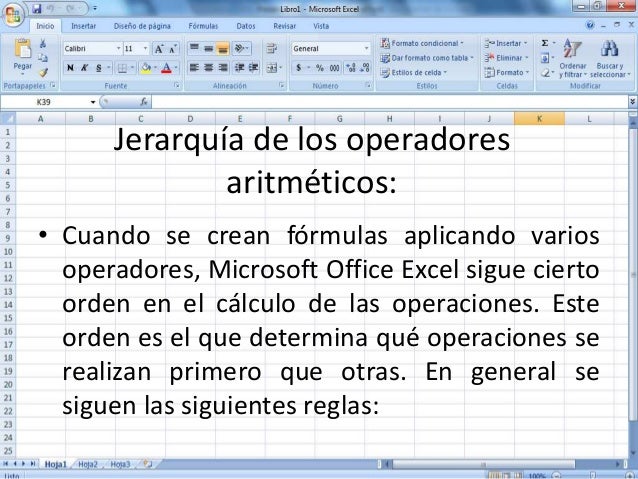 - 10. Jerarquía de los operadores aritméticos: • Cuando se crean fórmulas aplicando varios operadores, Microsoft Office Excel sigue cierto orden en el cálculo de las operaciones. Este orden es el que determina qué operaciones se realizan primero que otras. En general se siguen las siguientes reglas: