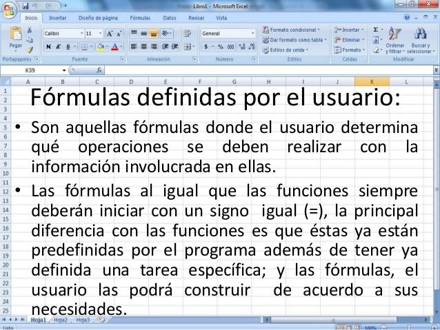 - 3. Fórmulas definidas por el usuario: • Son aquellas fórmulas donde el usuario determina qué operaciones se deben realizar con la información involucrada en ellas. • Las fórmulas al igual que las funciones siempre deberán iniciar con un signo igual (=), la principal diferencia con las funciones es que éstas ya están predefinidas por el programa además de tener ya definida una tarea específica; y las fórmulas, el usuario las podrá construir de acuerdo a sus necesidades.