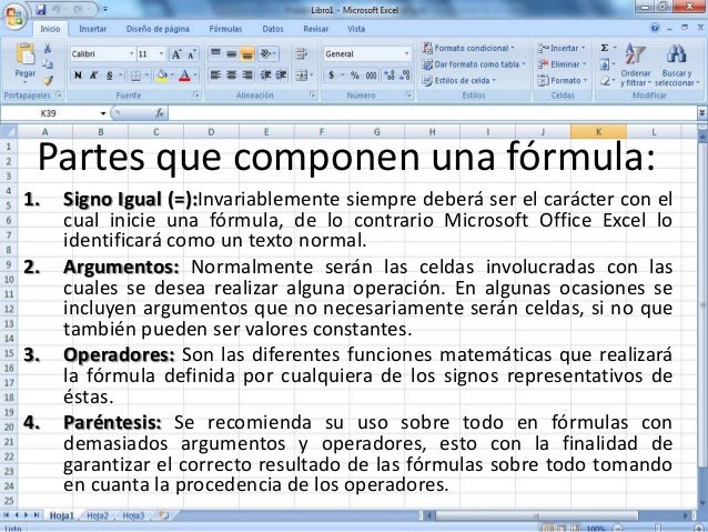 - 4. Partes que componen una fórmula: 1. Signo Igual (=):Invariablemente siempre deberá ser el carácter con el cual inicie una fórmula, de lo contrario Microsoft Office Excel lo identificará como un texto normal. 2. Argumentos: Normalmente serán las celdas involucradas con las cuales se desea realizar alguna operación. En algunas ocasiones se incluyen argumentos que no necesariamente serán celdas, si no que también pueden ser valores constantes. 3. Operadores: Son las diferentes funciones matemáticas que realizará la fórmula definida por cualquiera de los signos representativos de éstas. 4. Paréntesis: Se recomienda su uso sobre todo en fórmulas con demasiados argumentos y operadores, esto con la finalidad de garantizar el correcto resultado de las fórmulas sobre todo tomando en cuanta la procedencia de los operadores.