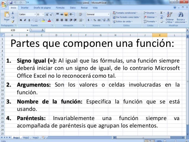 - 7. Partes que componen una función: 1. Signo Igual (=): Al igual que las fórmulas, una función siempre deberá iniciar con un signo de igual, de lo contrario Microsoft Office Excel no lo reconocerá como tal. 2. Argumentos: Son los valores o celdas involucradas en la función. 3. Nombre de la función: Especifica la función que se está usando. 4. Paréntesis: Invariablemente una función siempre va acompañada de paréntesis que agrupan los elementos.