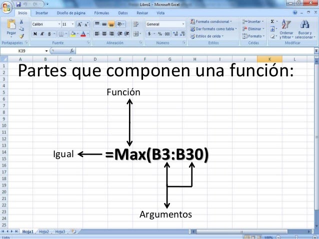 - 8. Partes que componen una función: Función =Max(B3:B30) Argumentos Igual
